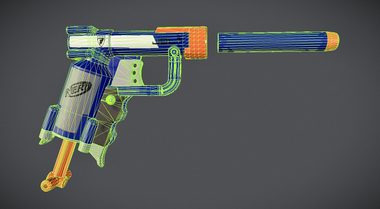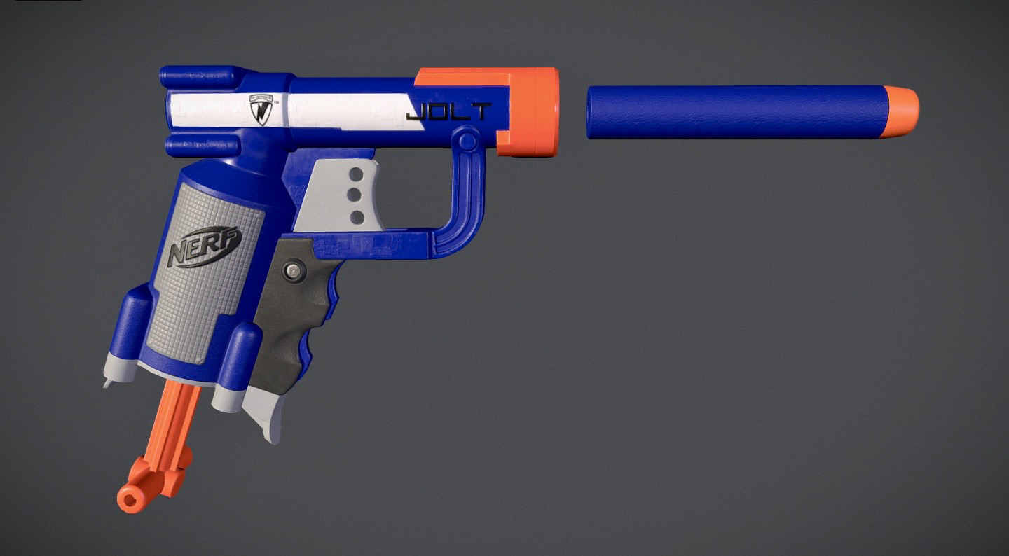 This is a game-ready model of a Nerf Jolt pistol, modeled to scale. I wanted to practice hard-surface weapon modeling, and I had this Nerf toy on hand and thought it would be a fun project! I also wanted to add a short, quick animation of loading and firing the bolt, which you can view on the Sketchfab viewer below.